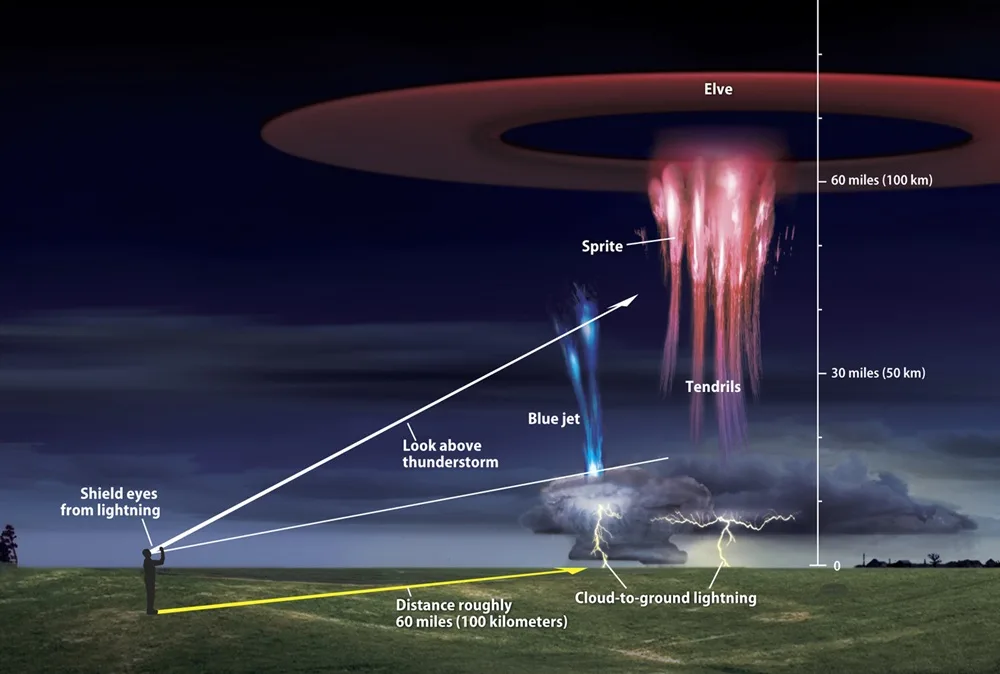 Sprites appear as red bursts shaped like jellyfish or carrots. Blue jets shoot upward like fountains. Elves spread as giant glowing rings, and ghosts leave a green shimmer. They happen so fast and faint that the naked eye often misses them, but cameras and satellites are finally capturing the show.
