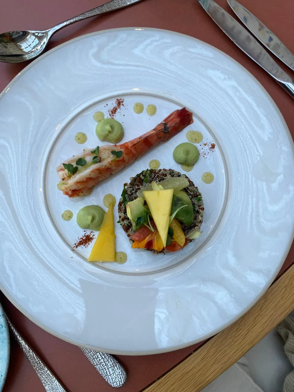 The first course — a quinoa salad with citrus, mint, avocado, and a gamba — was bright and refreshing, a clean beginning that matched the morning’s tone.