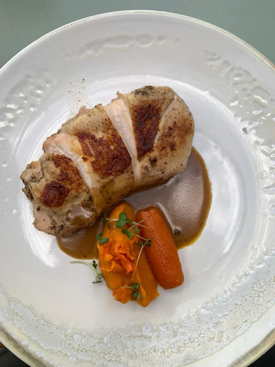 The main course featured a slow-cooked chicken escalope served with carrot purée and cumin. The chicken was remarkably tender, and the purée brought a subtle warmth that made the plate feel both comforting and light.