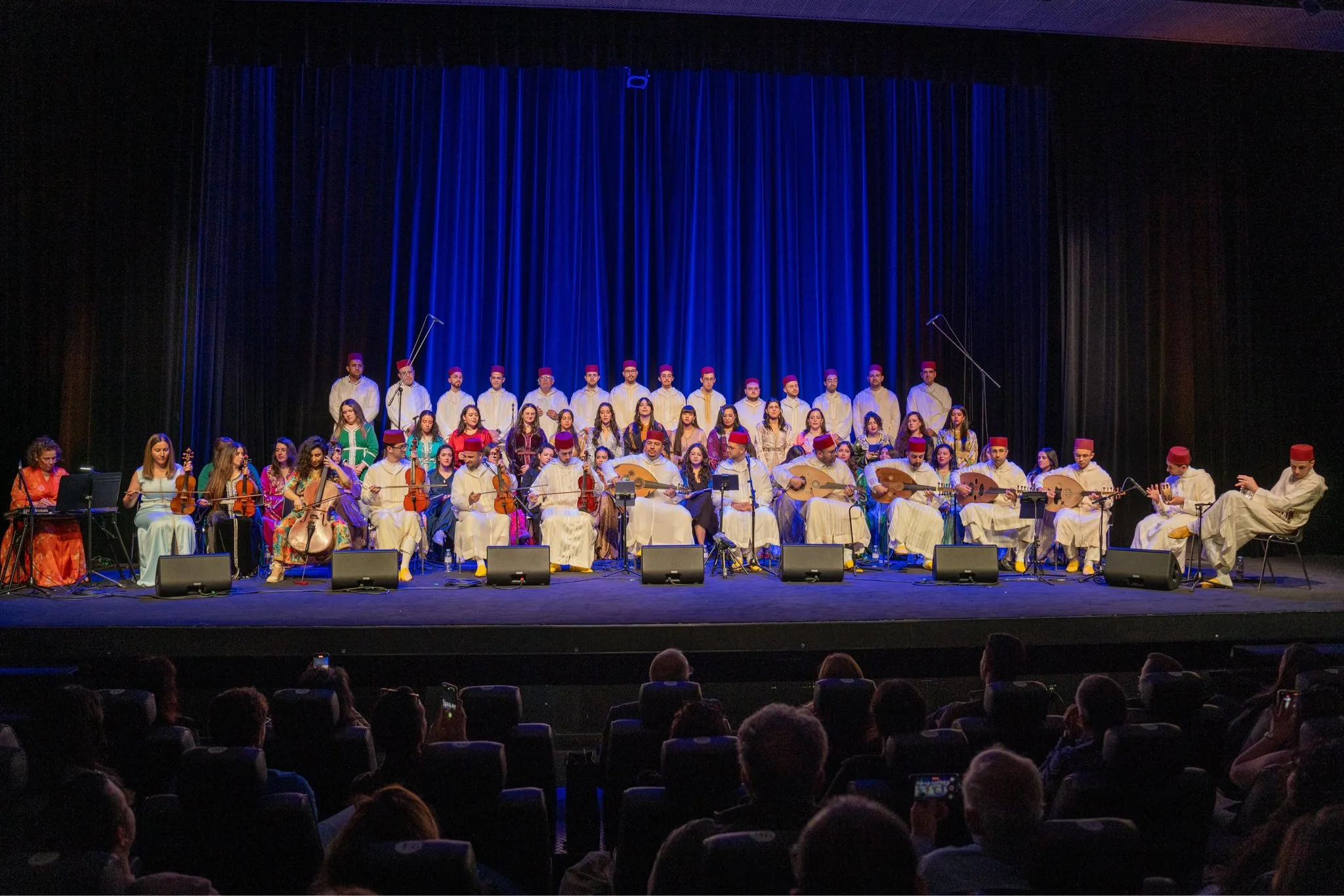Throughout the night, the audience was invited to explore a repertoire rooted in centuries of musical practice preserved in Morocco. The performance combined orchestral arrangements, choral singing, and poetic interpretation drawn from both classical Andalusian compositions and Morocco’s Sufi musical heritage.