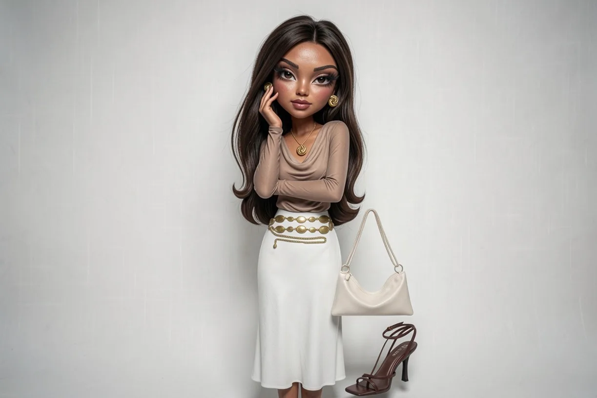 The outfit starts with a crisp white skirt, bringing freshness and lightness to the ensemble, paired with a warm brown top that adds depth and warmth.